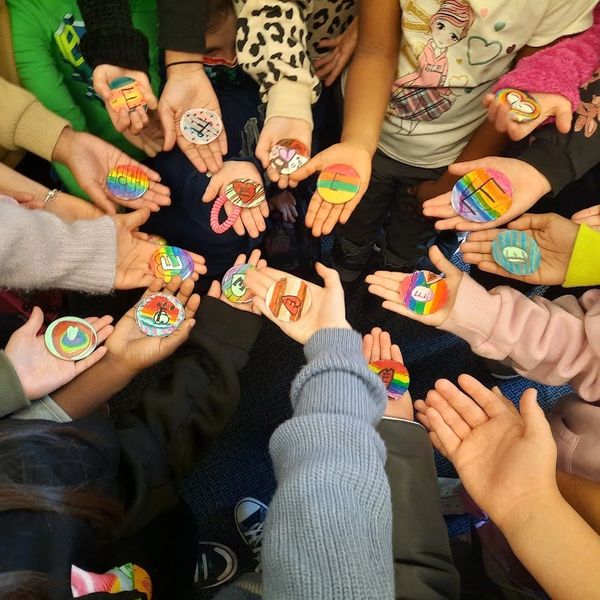 Members designed buttons to be identified in case someone needs a friend at recess so that the members could be easily identified.